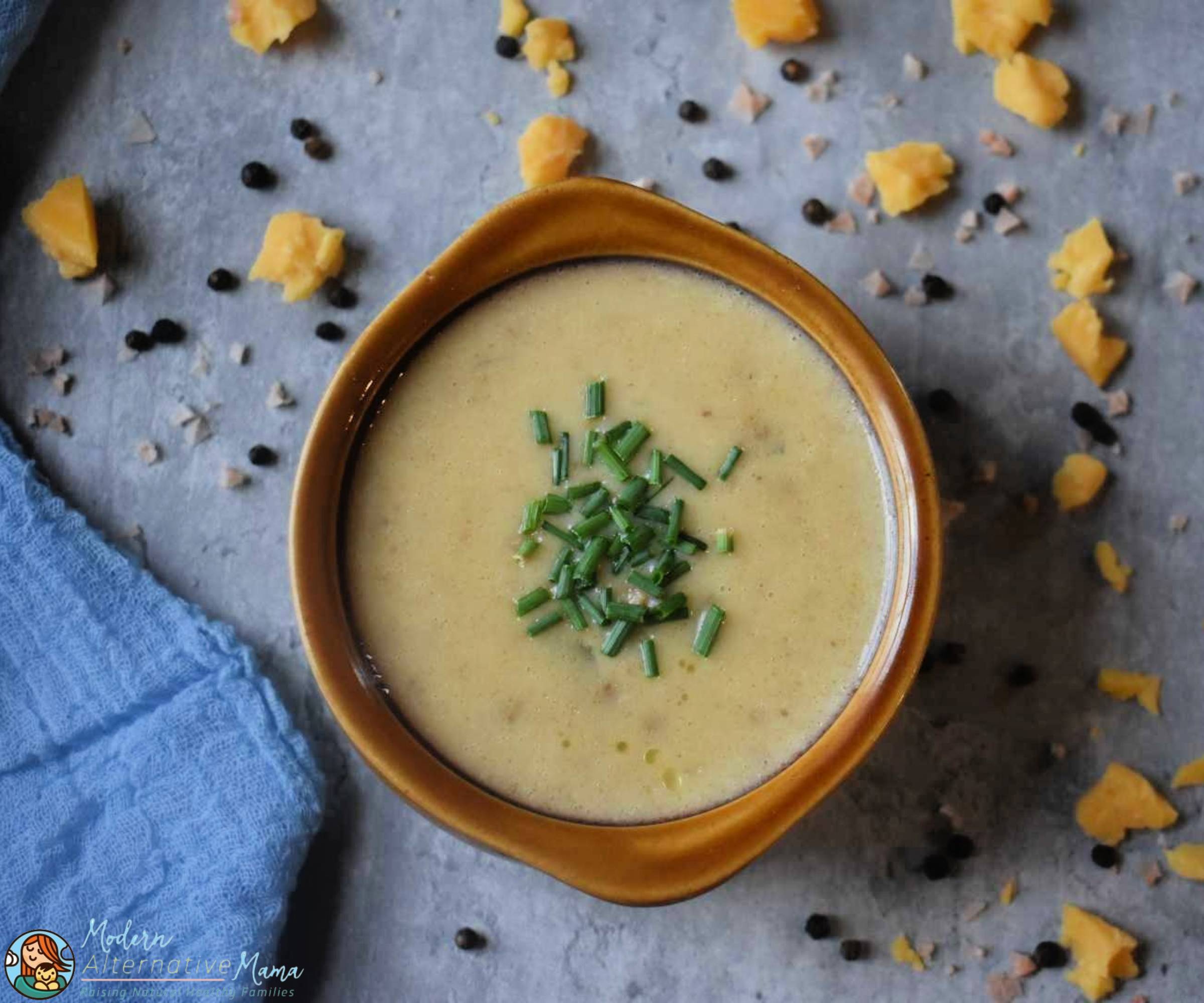 This is a very yummy, creamy soup that’s perfect for fall. It’s healthy and satisfying, too! If you have family members who aren’t so thrilled with normal broth-based soups, this is a way to sneak broth into them while eating a creamy and wonderfully rich soup. Plus, who doesn’t love cheese?